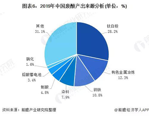 主要產生廢酸的行業為硫酸法鈦白粉行業、硫酸行業、有色金屬冶煉行業和鋼鐵酸洗行業。2019年,鈦白粉行業廢酸產出量為2675萬噸左右,占廢酸總產出量的28.2%;有色金屬冶煉行業廢酸產出量為1163萬噸左右,占廢酸總產出量的12.3%。